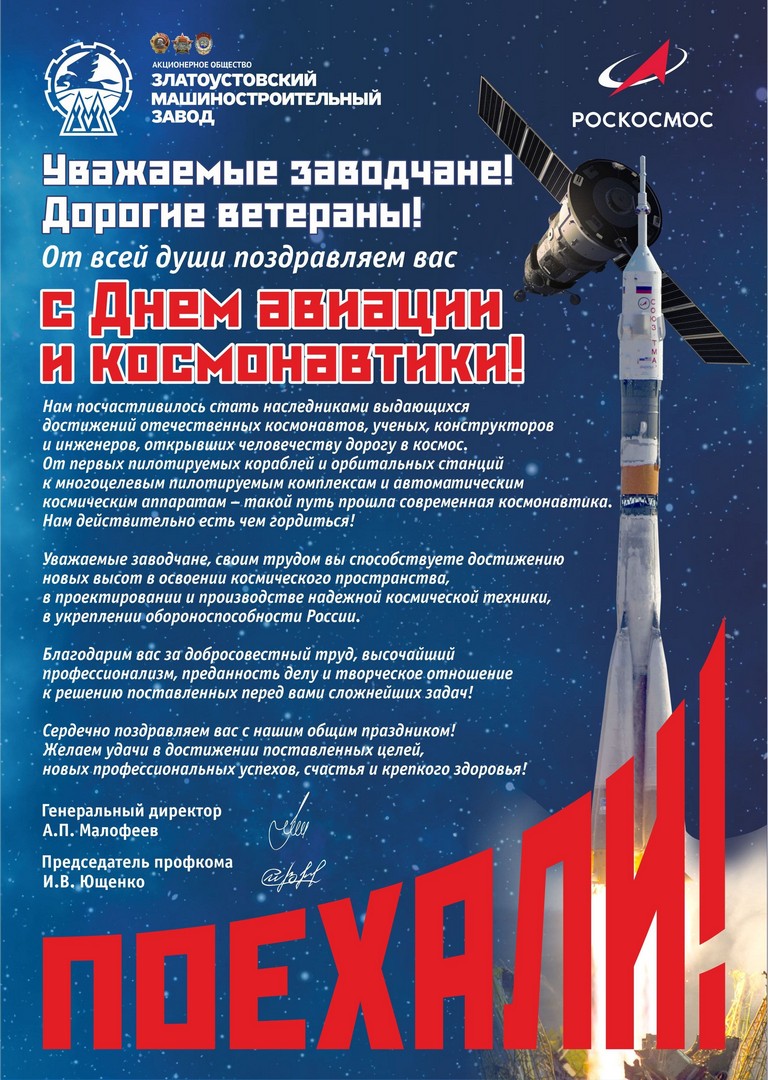 Поздравление с Днем космонавтики от генерального директора АО «Златмаш» Антона Малофеева и председателя профкома Игоря Ющенко